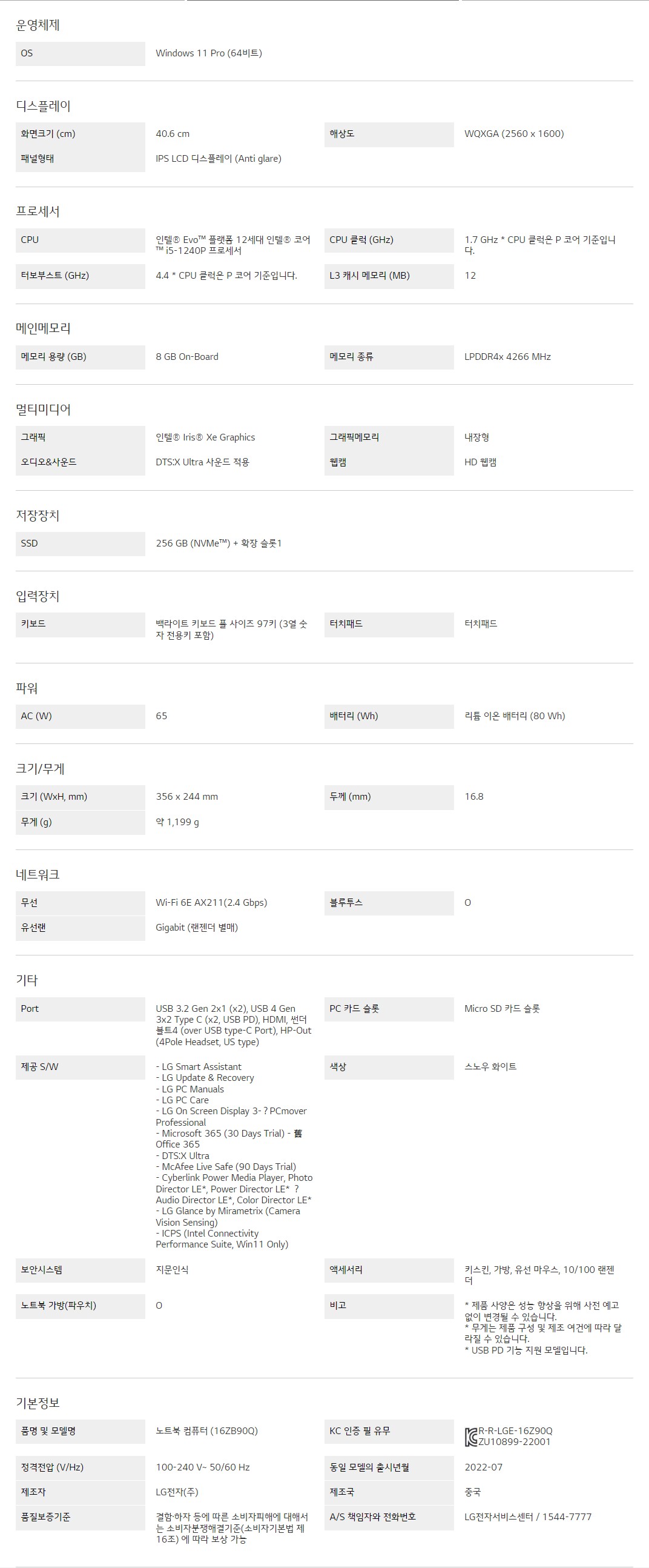 화면크기 (cm) : 40.6cmCPU : 인텔® Evo™ 플랫폼 12세대 인텔® 코어™ i5-1240P 프로세서메모리 용량 (GB) : 8 GB On-Board