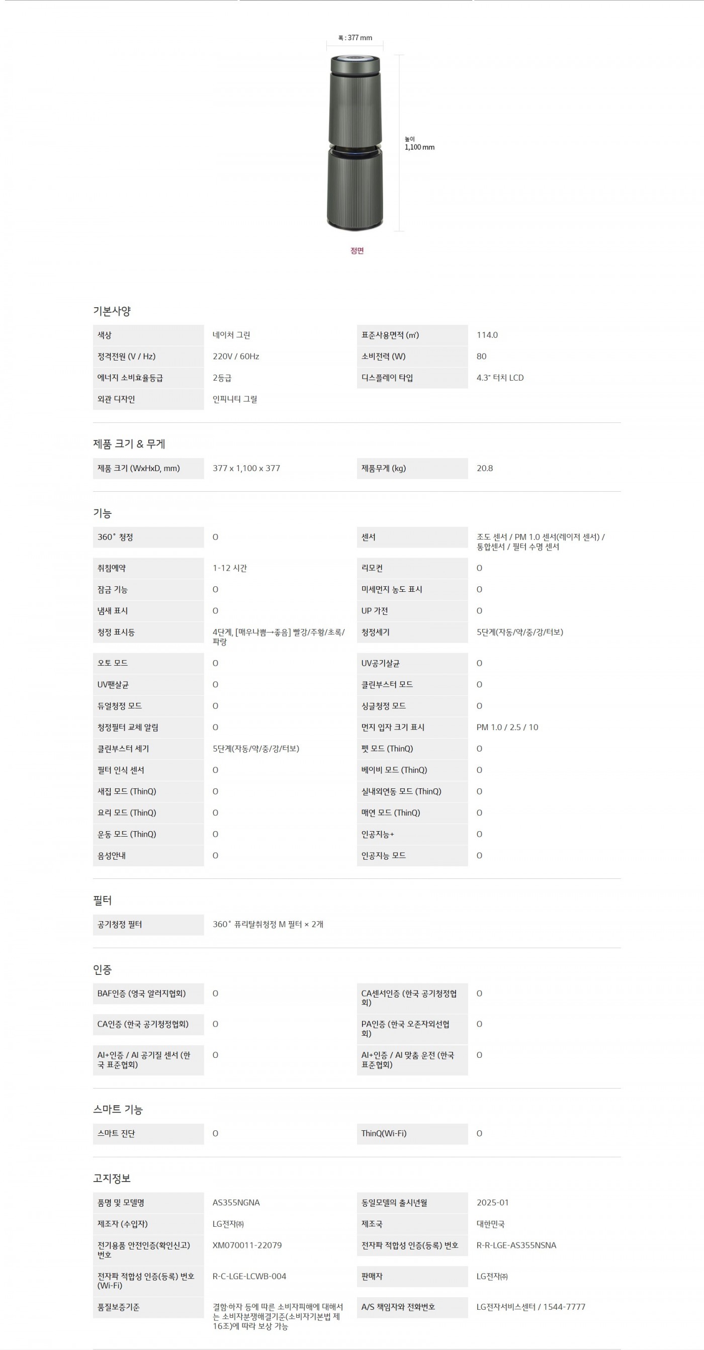 LG 퓨리케어 AI 오브제컬렉션 360˚ 공기청정기 (M 필터)